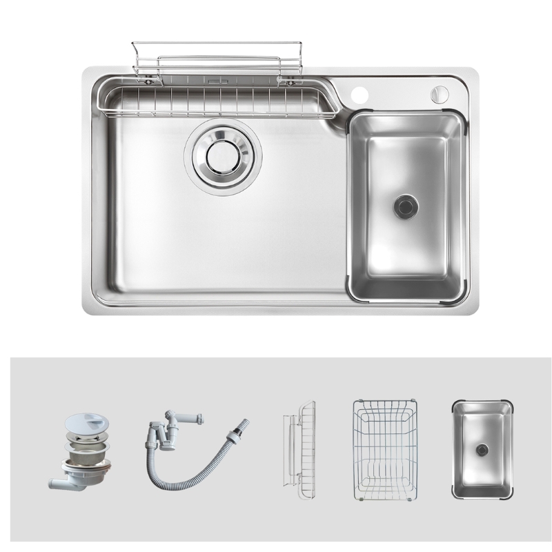Phụ kiện đi kèm01 chậu rửa lớn + 01 chậu nhỏ + 02 giỏ inox + 01 bát rác + 01 siphon chống mùi